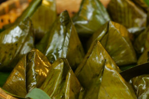 Banh It La Gai: A traditional cake with a wrapper made from glutinous rice flour and ramie leaves, filled with green bean paste or coconut, offering a delicate sweetness and a unique aroma. Often bought as a souvenir.