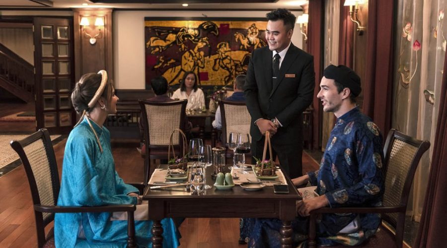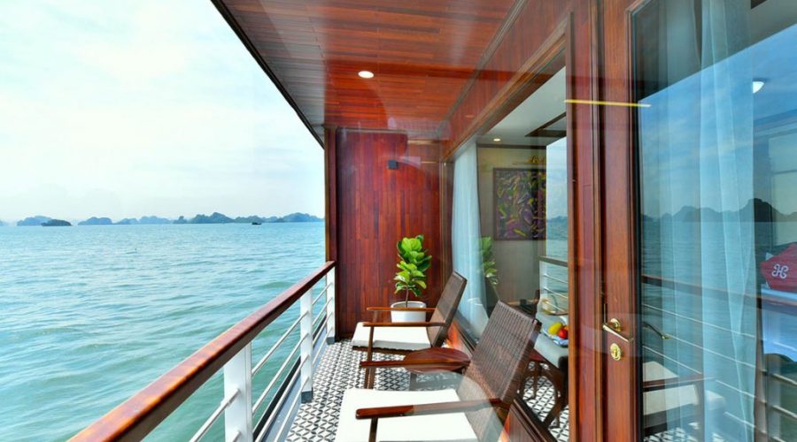 Shortly after departure, guests are presented with authentic Vietnamese cuisine in the ship’s restaurant. The itinerary proceeds to the scenic Tra Bau area or Ba Trai Dao Beach for swimming and kayaking excursions. Upon return, passengers may partake in onboard activities including massage treatments and afternoon tea service.