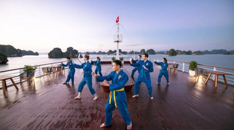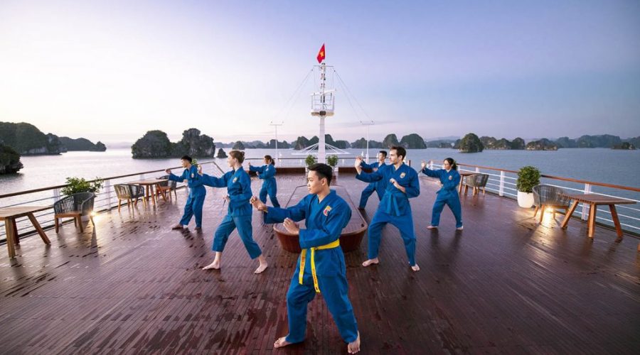 Begin your second day on Heritage Cruise with a demonstration of Vovinam, a traditional Vietnamese martial art, at sunrise. Subsequently, embark on a bamboo boat excursion to a local cave. Upon check-out, a brunch is provided as the cruise returns to Tuan Chau International Marina in Ha Long City.