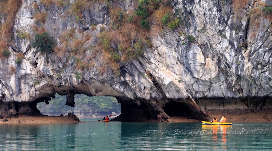 Kayak or local rowing boat through an array of stalagmite caves leaded into hidden lagoons